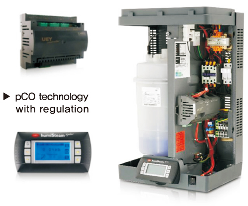 전극봉식 스팀 가습기HumiSteam은 전극봉식 스팀가습기는 실린더 내에 전극봉을 삽입하여 수중에 교류전류를 흘려 물을 가열하여 스팀을 발생시키는 가습기입니다. HumiSteam은 산업환경뿐만 아니라 건축시설 무균실에서 박물관까지 어떠한 시설에서도 모든 스팀가습기의 요구사항의 조건을 만족하는 가장 앞선 가습기입니다.
